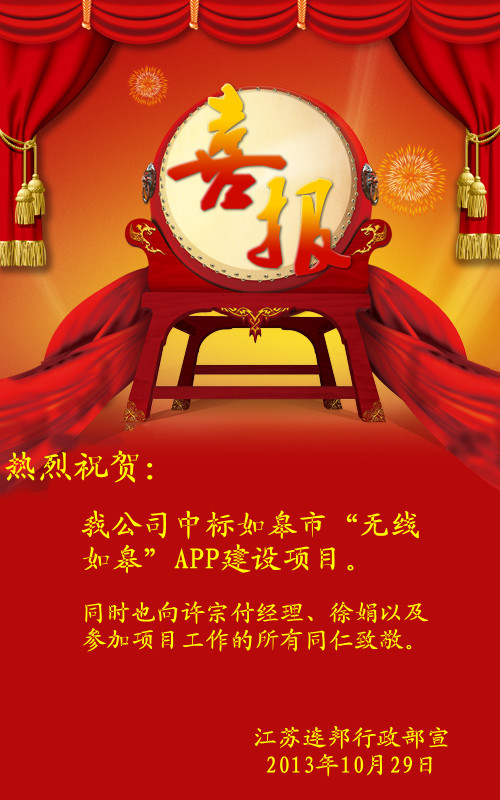 热烈祝贺江苏连邦中标如皋市“无线如皋”APP建设项目。同时也向许宗付经理、徐娟以及参加项目工作的所有同仁致敬。