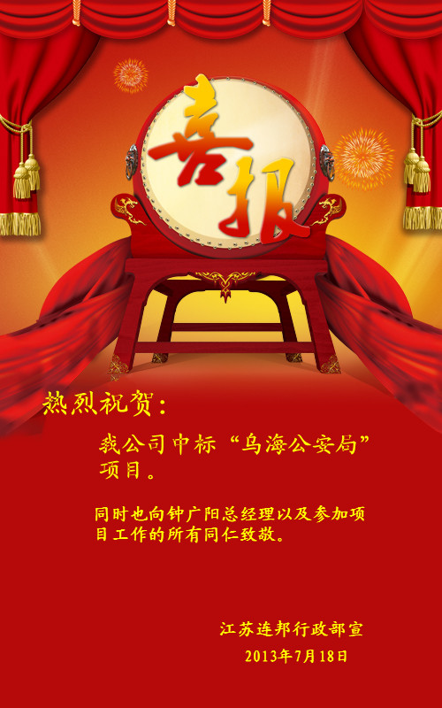 热烈祝贺江苏连邦中标“乌海公安局”项目。同时也向钟广阳总经理以及参加项目工作的所有同仁致敬。