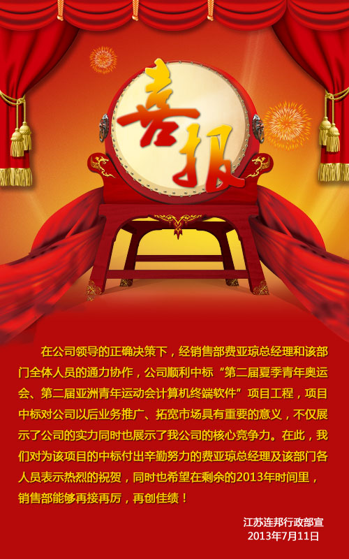 在公司领导的正确决策下,经销售部费亚琼总经理和该部门全体人员的通力协作,公司顺利中标 “第二届夏季青年奥运会、第二届亚洲青年运动会计算机终端软件 ”项目工程,项目中标对公司以后业务推广、拓宽市场具有重要的意义,不仅展示了公司的实力同时也展示了我公司的核心竞争力。在此,我们对为该项目的中标付出辛勤努力的费亚琼总经理及该部门各人员表示热烈的祝贺,同时也希望在剩余的2013年时间里,销售部能够再接再厉,再创佳绩!