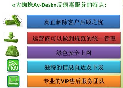 二、合作前景 随着个人电脑的普及和信息时代所带来的信息网络化,网络安全问题已经明显凸现,并日趋严峻,如何应对这一问题,已经成为一种必要,切实提高网络防御能力,才能确保这一问题的解决。 尽管2008年中国经济增速放缓,但日趋严重的网络安全拉动了中国网络安全平稳较快的发展,2008年中国网络安全市场的总销售额较2007年增长了16.6%,09年第二季度中国网络安全市场收入规模达28.2亿元,环比增长10.1%,同比上升45.5%。有专家预测,在未来三年中,国的网络安全市场规模预计将增长至109.35亿元。总部坐落在俄罗斯首都莫斯科Dr.Web有限公司,作为俄罗斯军方和克里姆林宫专用全解决方案开发企业在俄罗斯本土与卡巴斯基并驾齐驱。08年4月进军中国市场以来,迅速在竞争激烈的杀毒软件市场异军突起,并被业界誉为“08国内杀毒新神话”。 作为江苏地区最大的正版软件销售商之一,同时也作为江苏省大蜘蛛的总包销商,为加强对江苏市场的开发力度,江苏连邦现面向江苏地区诚招合作伙伴,江苏连邦衷心的欢迎您与我们一起用激情和实力,在网络安全的广大市场中共谋发展、共创佳绩、共同开拓充满前景的事业。我们真诚地期待您的加盟,合作共赢,共创美好明天。 三、合作形式 江苏连邦根据市场特点及行业状况,目前采用“区域代理制”与行业客户进行合作。 四、合作条件 1. 认同江苏连邦公司的经营思想和合作模式,认可大蜘蛛系列产品的质量。 2. 具有固定办公场所和独立法人公司资格,具备一定的相关软件销售市场经验。 3. 拥有一支专业的营销队伍,具备一定相关的客户销售和服务能力。 4. 可以根据当地的市场情况,切实可行的制订的“市场拓展计划”,并积极主动的开发当地市场。 5. 接受江苏连邦公司对其经销大蜘蛛系列产品相关市场、技术的指导监督;遵守江苏连邦的市场营销政策和其他管理规定。 6. 在合作期间完成(或超额完成)协议规定的最低任务。 五、权益保障 1. 特许专卖权:享有大蜘蛛系列产品的特许专卖经销权。 2. 形象使用权:免费使用大蜘蛛总部提供的品牌形象系统。 3. 区域保护权:在所在区域内独家经营; 4. 代理优先权:同等条件下,优先享有晋升区域代理级别权; 5. 业绩鼓励奖:完成规定的销售业绩(进货额),代理商可获得奖励; 六、加盟流程 1.江苏连邦公司市场部直接或间接地与当地行业客户(以下称意向合作伙伴)取得联系,双方探讨合作的可能性。 2.意向合作伙伴按照江苏连邦公司要求详细介绍意向代理区域(江苏连邦公司保留对当地市场及意向合作伙伴进行实地综合考察的权利);其间,意向合作伙伴可到江苏连邦公司考察并了解产品。 3.江苏连邦公司在对意向合作伙伴的经营条件和实力进行综合评估,达到加盟条件后,对意向合作伙伴宣传应遵守的市场政策及销售任务,然后根据当地市场情况,确定双方进行合作的形式,签定“代理协议书”;最后江苏连邦公司对合作伙伴展开市场、技术培训指导,双方合作正式开始。 七、招商区域 江苏省内13个地级城市。 八、招商热线