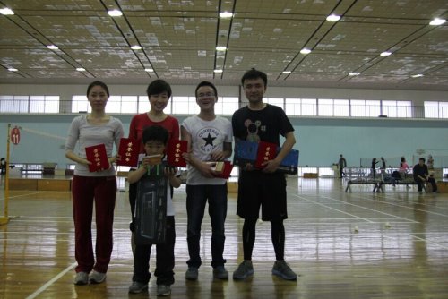 淘汰赛中还有个小花絮,虽然我们也知道此次比赛中我们还是以娱乐和运动为主,但是小田同学你把羽毛球能打到场馆高近十米的天花板上,你也是蛮厉害的。 女子单打中还有两名高手,这两名都出自后勤部,一名是朱艳艳,一名是胡守玲。从来也没听她们说过多会打球的,到了场上却是生龙活虎。一个擅长远距离拉距战,一个擅长小球战术。这两名终于一路拼到了决赛。朱艳艳获得了女子组单打冠军,胡守玲获得女子组单打亚军,孙丹丹获得女子组单打季军。
