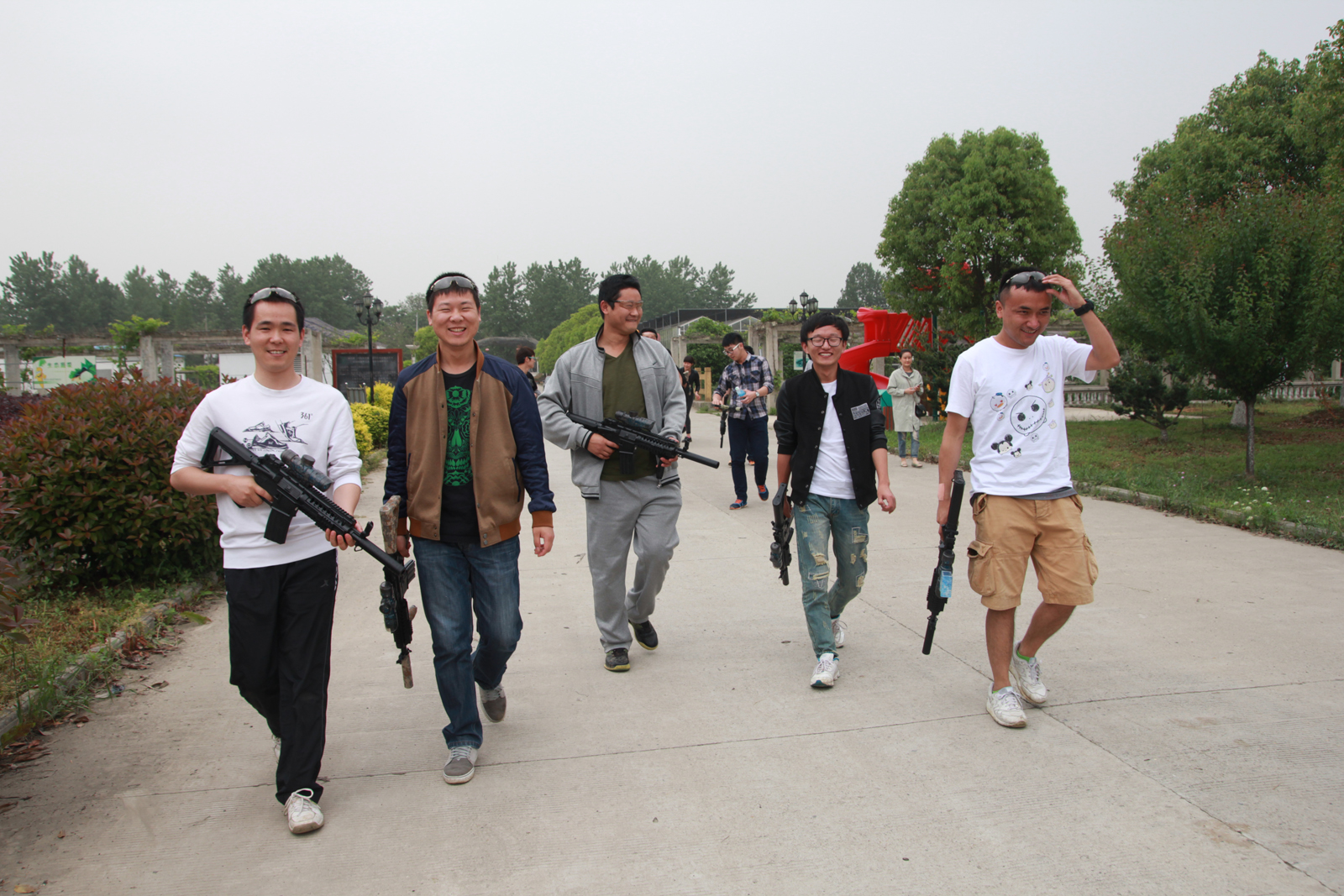5月7日,公司组织全体员工一起到南京林大生态园一日游活动。活动包括桌游、烧烤、真人CS、撕名牌等。这天天公作美,没有烈日炎炎,也没有阴雨霏霏,刚刚好。我们乘坐公司大巴不到一个小时便到了目的地——南林大生态园。 这是一座生态园,距离南京市区大约20公里,有时令果蔬可以采摘,也有优美的风景可以欣赏。我们下了车之后,便三个一群,五个一组的自组小队嗨起来了。撕名牌大战是年轻人较为喜欢也是时下比较流行的一个活动,这帮家伙平日里看还是挺斯文的,一到了“战场”,那真是有冤的报冤,有仇的报仇了。这撕的那叫一个酣畅淋漓,把人家主办方的衣服都撕破了,还有一个撞树上把脸划破了,亲们,你们要注意安全呐! 最后,果然是我们李总带领的年富力强的研发组小伙子们获得了胜利,谁让他们男生多呢!奉上一组靓照: 中午时,大家开始犒劳饥肠辘辘的肚子啦! 这边一个锅灶,那边一个锅灶,开始自力更生了。烧烤大家都不专业,但是慢慢在烤糊一两只肉串后渐入佳镜,小朋友也加入进来了。 午餐后,大家展开一场激烈的真人CS,看看我们的队伍吧! 像不像铩羽而归的将士? 大家在“枪林弹雨”中拼命博杀,这位“壮士”,你好投入啊! 这场活动,在大家的欢声笑语中结束,这也让彼此间的互动更加热烈,让往日的劳累也烟消云散。大家更期待着下一次的对抗!