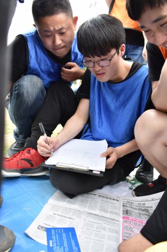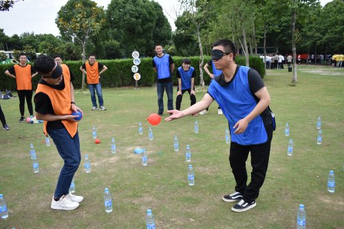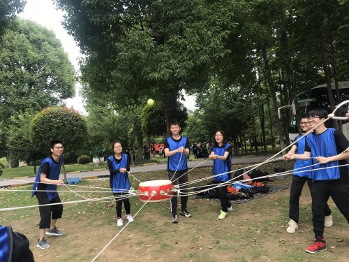 在一系列“军事整顿”后,我们展开了第一个项目的PK:鼓动人心。两队在一个晃动的鼓面看哪个队能把球颠的最多,这被我们认为是一个不太可能完成的任务,因为这个鼓是被十几号人扯起来的,这其中得兼顾平衡、力度、配合等等。但是看似不可能,我们战狼队,却以76的好成绩拿下这局的冠军,事后我们分享时,大家一致认为团队的成功离不开每个人的配合。